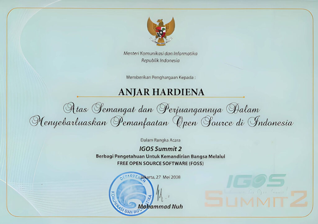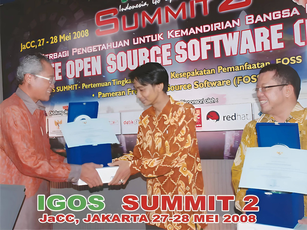 Saya ingin mengucapkan terima kasih sebanyak-banyaknya kepada semua teman-teman yang telah mendukung dan mendorong saya hingga menerima penghargaan di IGOS Summit 2. Penghargaan ini diberikan pada acara yang luar biasa di JaCC (Jakarta Convention Center) pada 27-28 Mei 2008. Di sana, saya berkumpul bersama para aktivis dan pelopor open source untuk berbagi visi besar dalam memajukan teknologi open source di Indonesia.